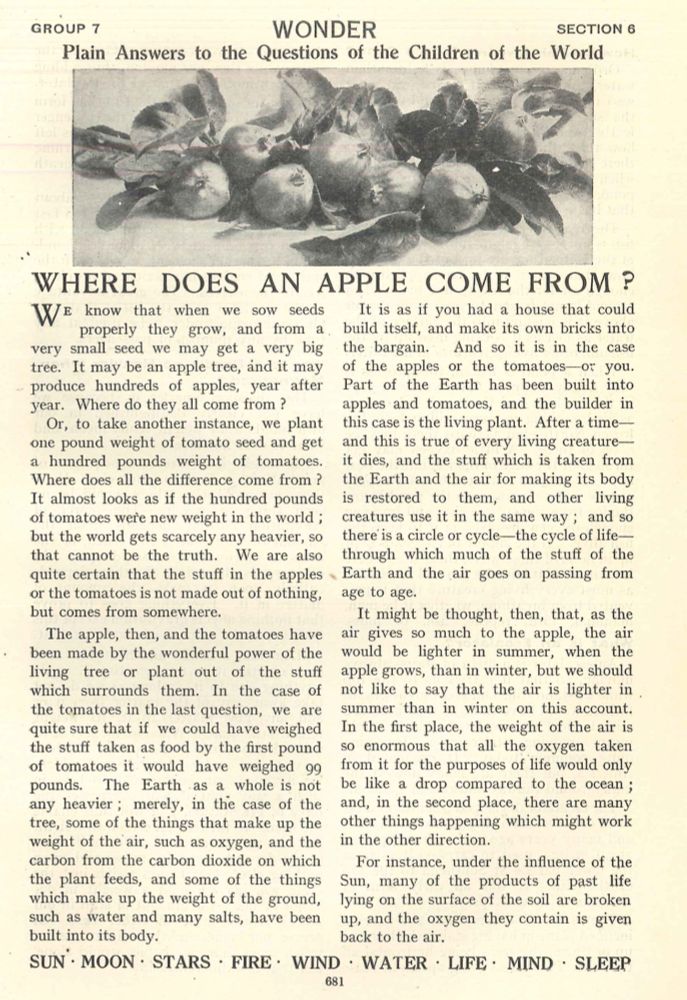 One of these snippets was a picture of a page of The Children’s Encyclopaedia (see featured image) which, under the rubric ‘Wonder’ contained the answer to the question “Where does an apple come from?” This was accompanied by the comment: “An extract from what Crick described as ‘the most important book I ever read’ – Arthur Mee’s THE CHILDREN’S ENCYCLOPAEDIA (he had the 1910 bound edition).”