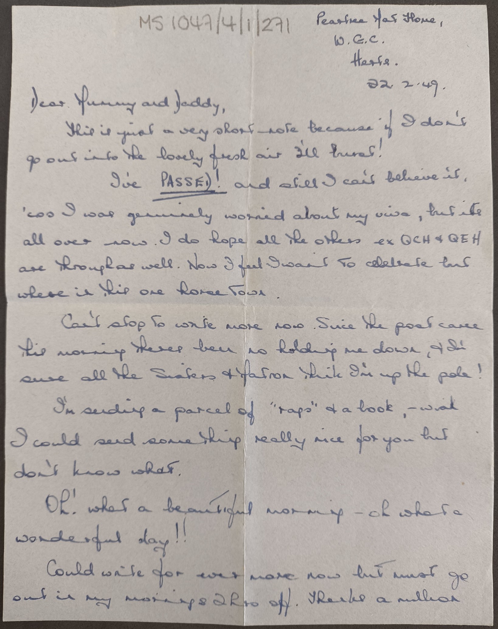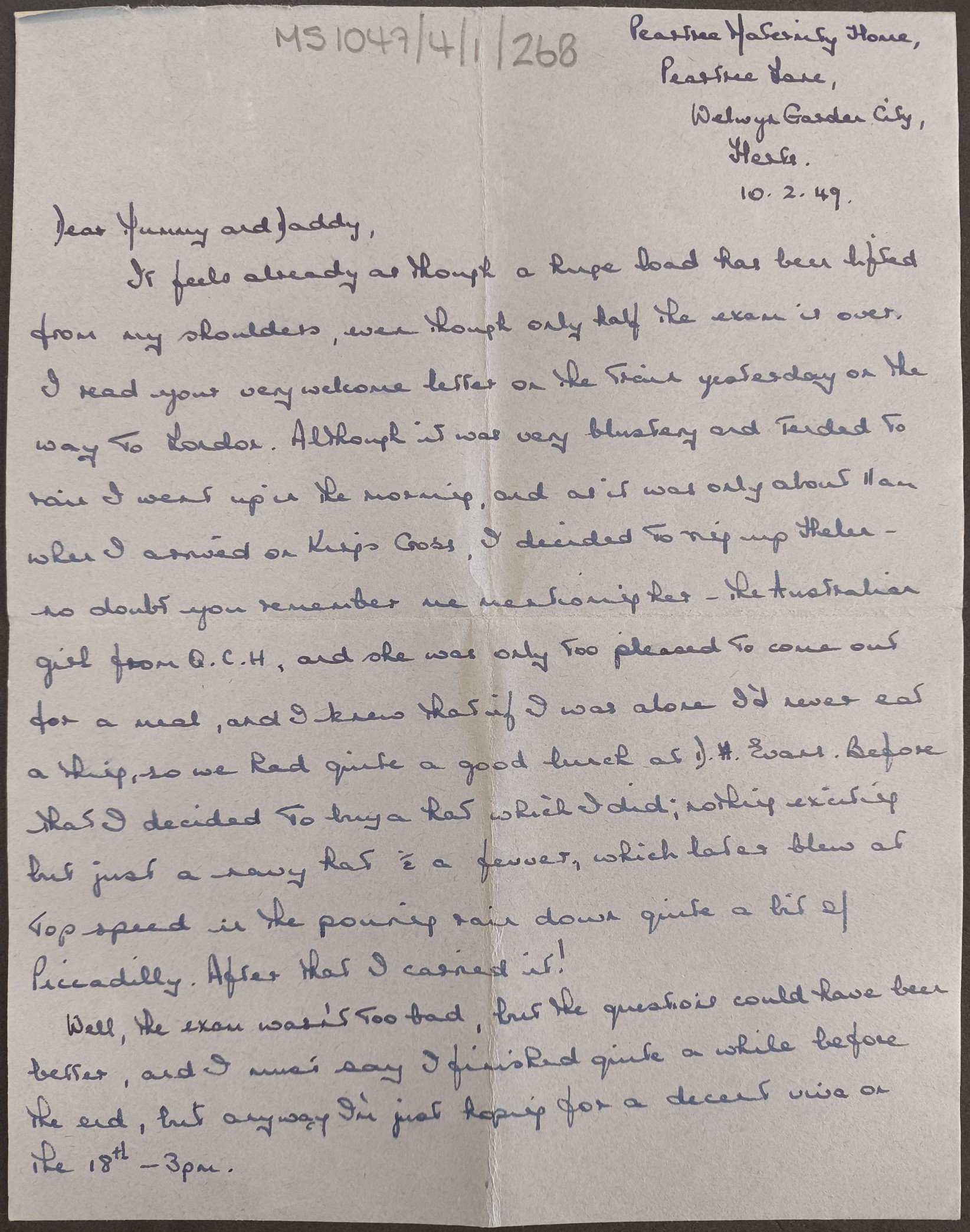 However, it seems that Dinah wasn’t fazed, because she wrote to her parents exuberant less than two weeks later: ‘I’ve PASSED! And I can’t believe it, ‘cos I was genuinely worried about my viva, but it’s all over now. I do hope all the others –ex QCH and QEH are through as well. Now I feel I want to celebrate but where in this one-horse town’. Apologies if any of you are from Welwyn Garden City, I’m sure it’s lovely there, but Dinah was not a fan. It seems that for her, nothing could ever live up to the dizzying heights of London, where she had previously trained and – based on her correspondence – seemed to spend most of her time queueing to buy rush tickets for West End musicals. I hope that any examinations which are coming up for all of you go similarly well, and that Dinah’s example shows that even though training can be a long process which is difficult at times, hopefully it will all be worth it in the end!
