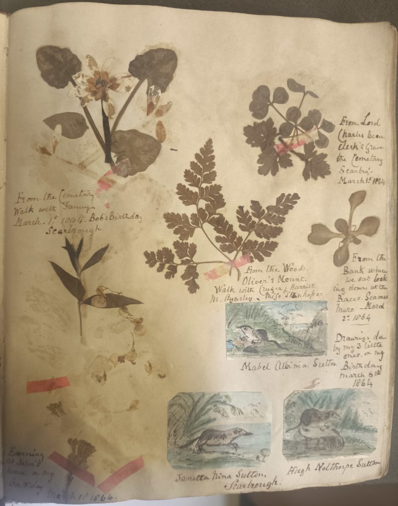 A page from MS 1067, Scrapbook of annotated sketches, pressed flowers and feathers compiled by Charlotte Sutton (née Nelthorpe, 1817-1872) of Bilsthorpe; 1864-1865